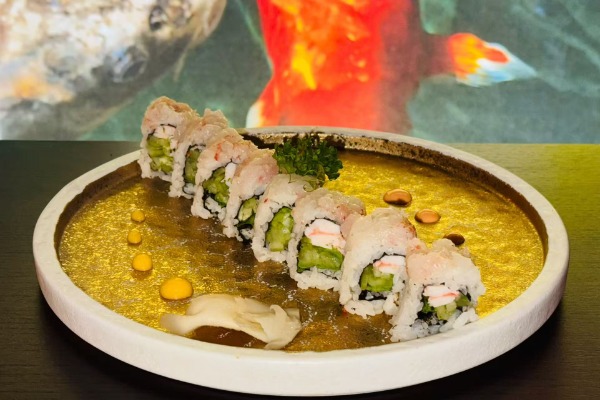 Roll di riso farciti con gambero cotto,granelle di tempura, guarnito con tobiko e teriyaki