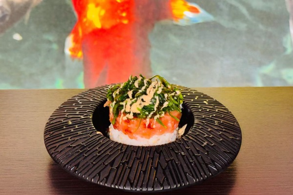 Roll di riso farciti con avocado, philadelphia,avvolto con tartare di salmone, salsa teriyaki e mandorle