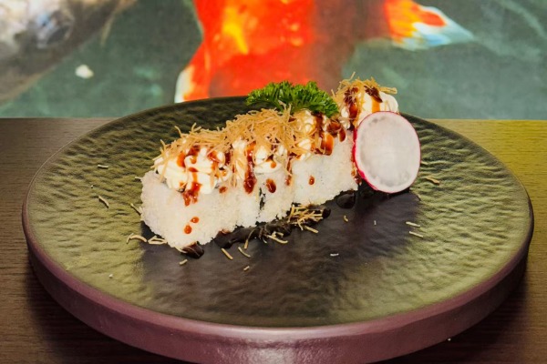 Roll farcito con granelle di tempura e Philadelphia, guarnito con Philadelphia, salsa sesamo, teriyaki e pasta kataifi